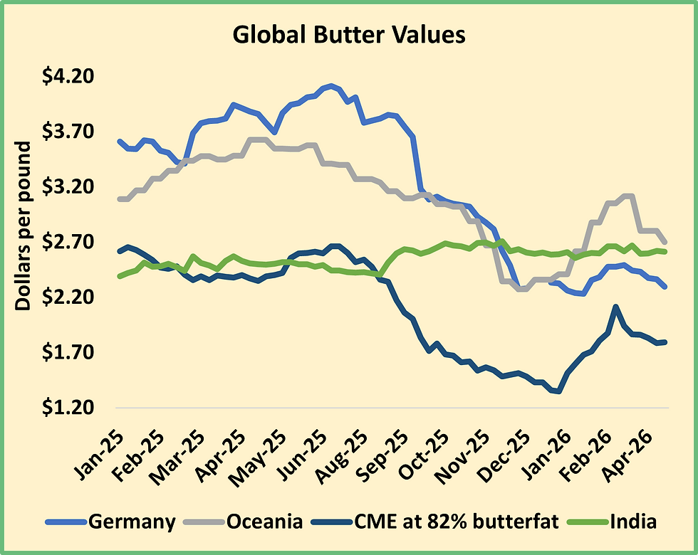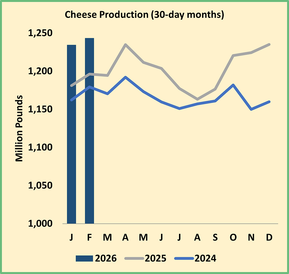 The other dairy markets showed none of NDM’s exuberance. CME spot Cheddar blocks and barrels both finished the week right where they began it, with blocks at $1.5775, in the middle of the recent trading range. This relative stability reflects a market that is concerned about record-shattering output but buoyed by record-smashing exports. The trends look comforting at first glance. In February, cheese output outpaced prior-year volumes by 3.9%, while exports set a new all-time high, with shipments up 30.1% from February 2025. But the absolute numbers are less reassuring. While output was 44 million pounds greater than the prior year, exports grew 32 million pounds. In January and February, exports absorbed just 43% of the year-over-year increase in cheese production. U.S. cheese prices must stay low enough to attract international buyers at the current breakneck pace. At some point, they may need to drop low enough to move cheese abroad even faster.