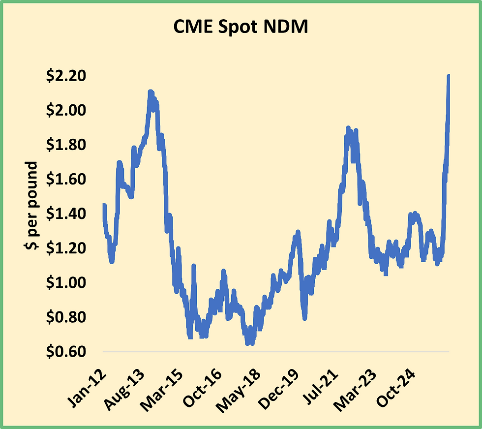 The milk powder market is sprinting straight uphill. Nonfat dry milk (NDM) rallied another 8.5ȼ this week and reached $2.20 per pound, the highest-ever price in the product’s 18-year tenure at the CME spot market. The short squeeze continues. USDA’s Dairy Market News reports that spot loads are tight from coast to coast, and they’re “particularly difficult to find in the Central region” where the expansion in cheese processing capacity has reduced the need for balancing. Even as milk production ramps up for spring, dryers in the region are running somewhat light.