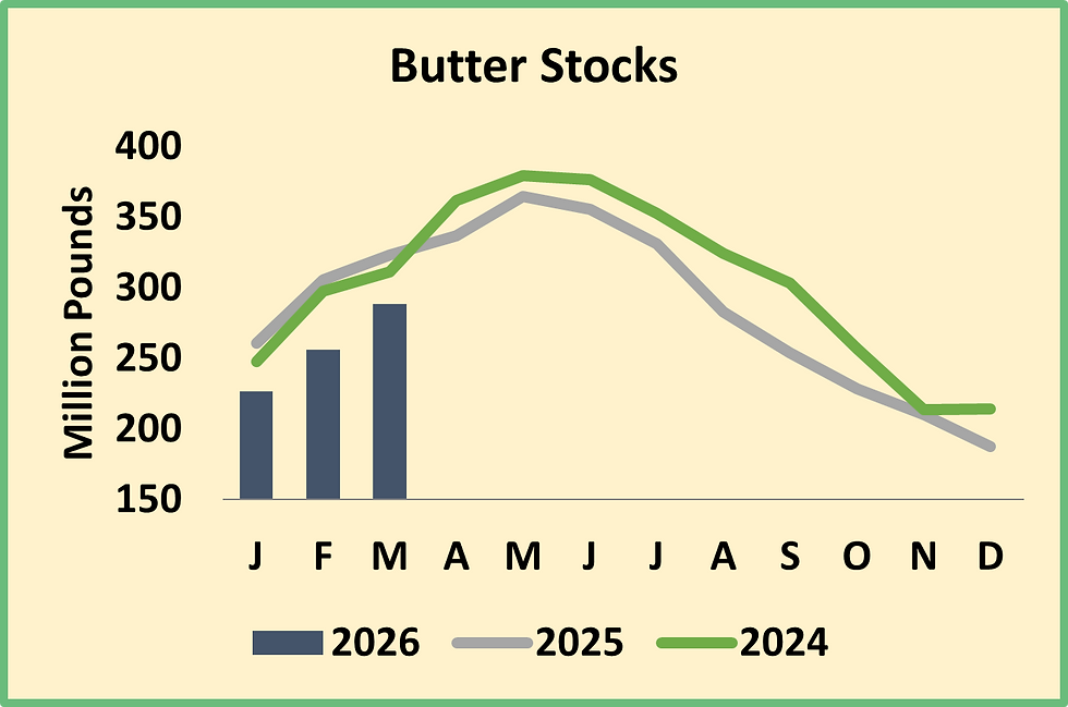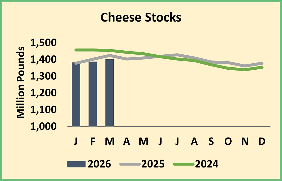 Cheese inventories climbed too, but the 13.5 million pound increase was in line with seasonal trends. Cheese output is formidable, but thanks to record-smashing exports and decent domestic demand, cheese stocks are not burdensome. March inventories were 1.6% lower than 2025 volumes and the lowest March tally since 2020. Relatively tight stocks buoyed Cheddar prices from their late-2025 and early-2026 lows south of $1.40/lb. This week, CME spot Cheddar blocks rallied 6.75ȼ to $1.645 per pound. But further upside may be limited. The U.S. dairy industry has invested in significant increases in cheese production capacity, and prices must stay low enough to maintain robust exports. Otherwise, cheese can pile up very quickly.