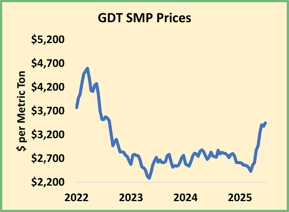 And they continue to do so. Last month, producers added another 8,000 head, and the dairy herd expanded to 9.621 million cows, once again reaching the largest dairy herd since 1993. There are 187,000 more milk cows in U.S. dairy parlors than there were a year ago, and together they made 2.3% more milk than in March 2024. The industry expected big increases in cow numbers in the states that also boasted big expansions in processing capacity. And indeed, there are 47,000 more cows in Kansas than there were a year ago. The Texas dairy herd is up 31,000 head year over year, and dairy producers added 24,000 cows in New York, 18,000 cows in Idaho, and 15,000 cows in South Dakota. But the industry is also absorbing expansion in Wisconsin (+27,000 head) and Michigan (+16,000 head) where investments in processing capacity were slight in comparison. In contrast to growth in the Plains, where a few new massive dairies account for most of the increase, growth in the Great Lakes has been incremental, with a new heifer barn here and a parlor revamp there. We can expect more growth of this kind. The big push to add cows in the Central Plains is largely complete, but the market is screaming at producers to find ways to keep their barns and milk tanks full.